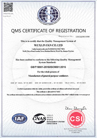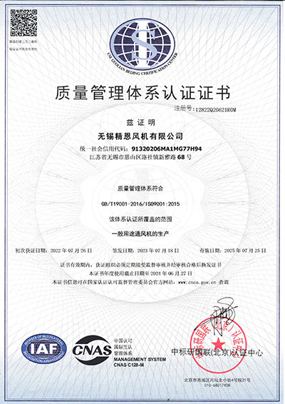 精恩风机以精益求精为制造理念,拥有专业的质量保障部门。确保交给我们客户的每一个产品都是经过严格检验并符合设计要求的。并且早在2009年便通过了IS09000质量体系认证。